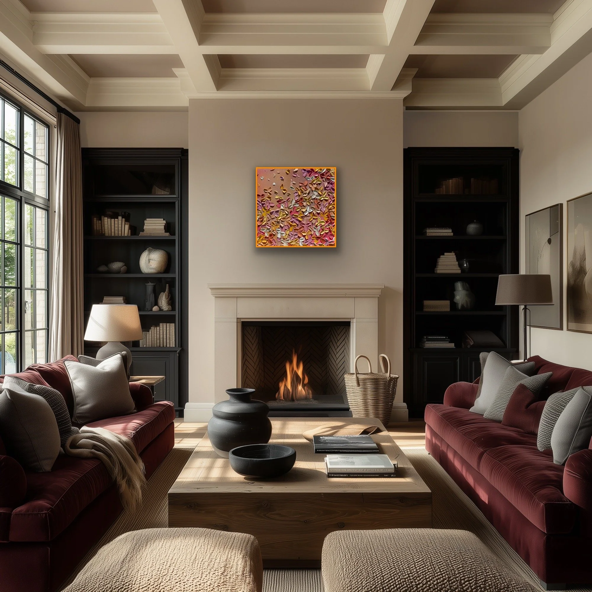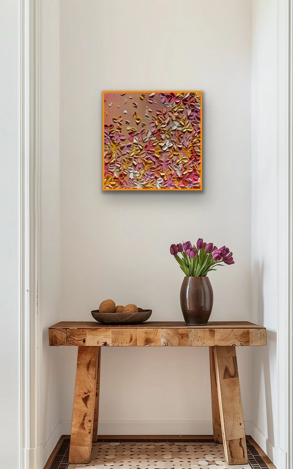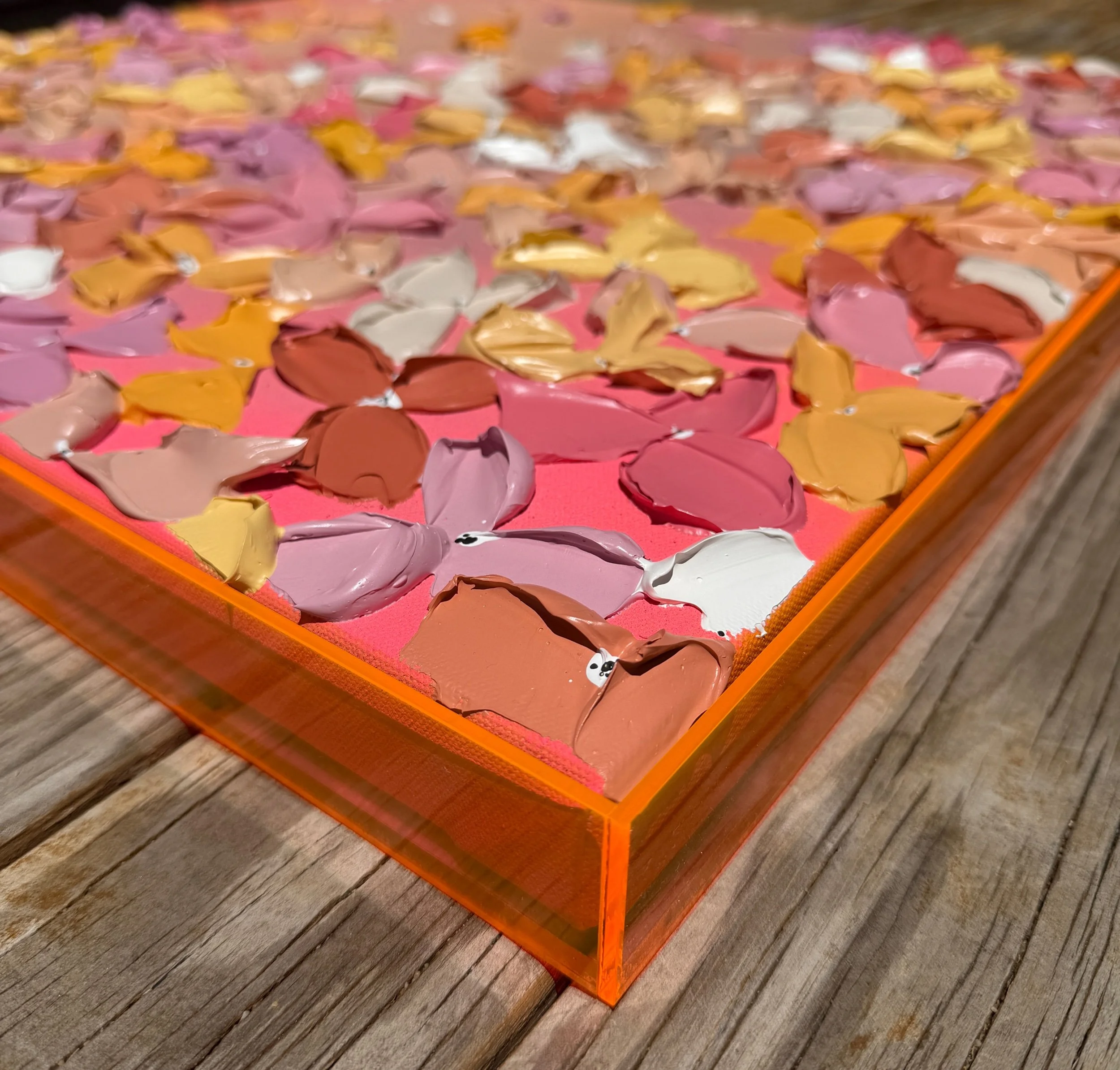 This painting comes framed in orange/pink acrylic, varnished for protection, ready to hang with a cord and signed / dated on the back of the artwork.