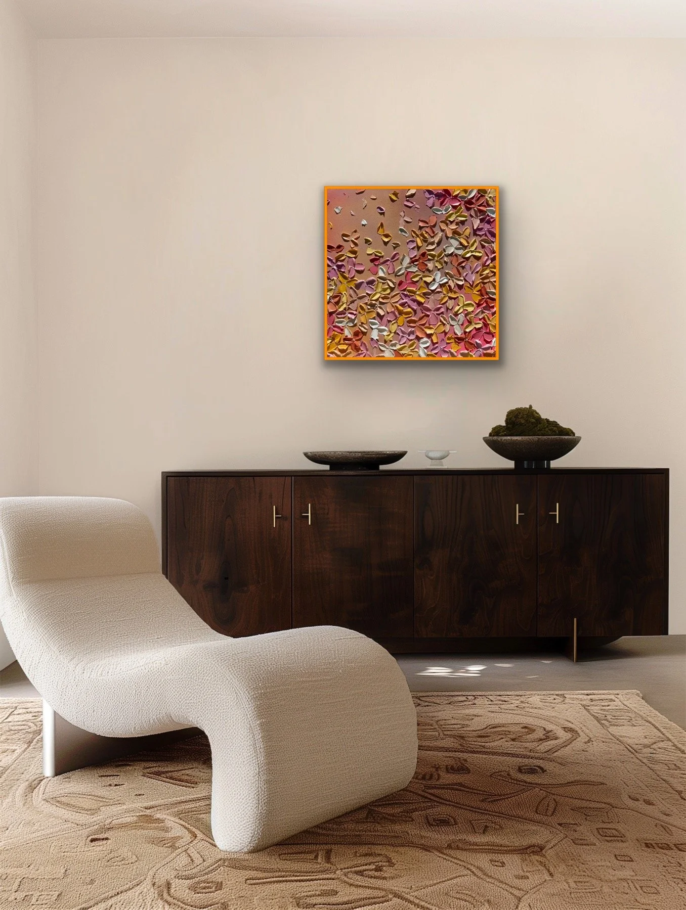 Created using a palette knife and thick acrylic paint mixed with impasto to create a textured surface which adapts depending on light and shadow within the room.