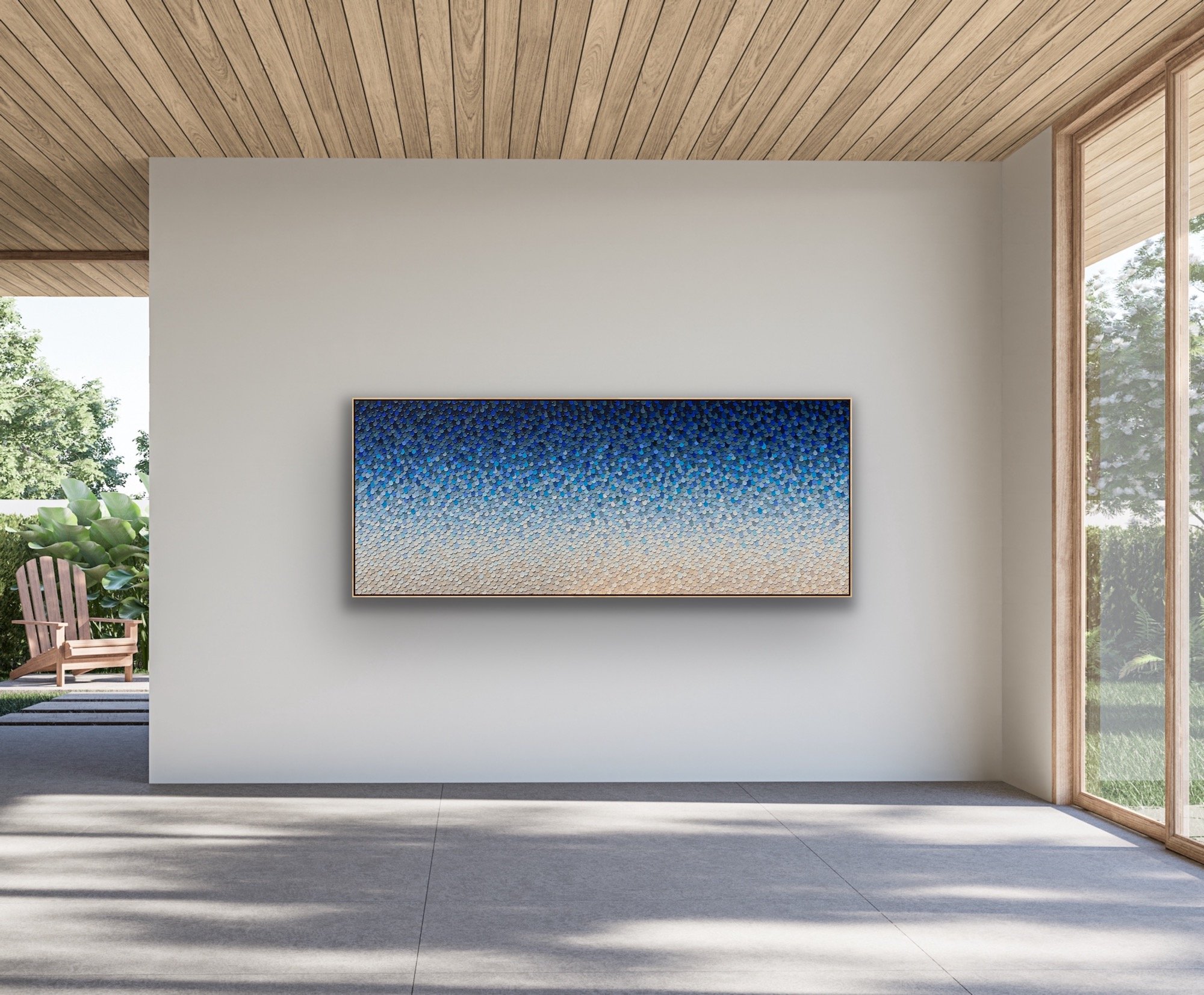 120cm x 70cm framed in oak. drops style in blues/sand Amalfi coast colours.